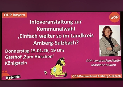 Am Donnerstag den 15.01.2026, findet im Gasthaus ‚Zum Hirschen‘ in Königstein ab 19.00 Uhr die erste von drei Informationsveranstaltungen der ÖDP…